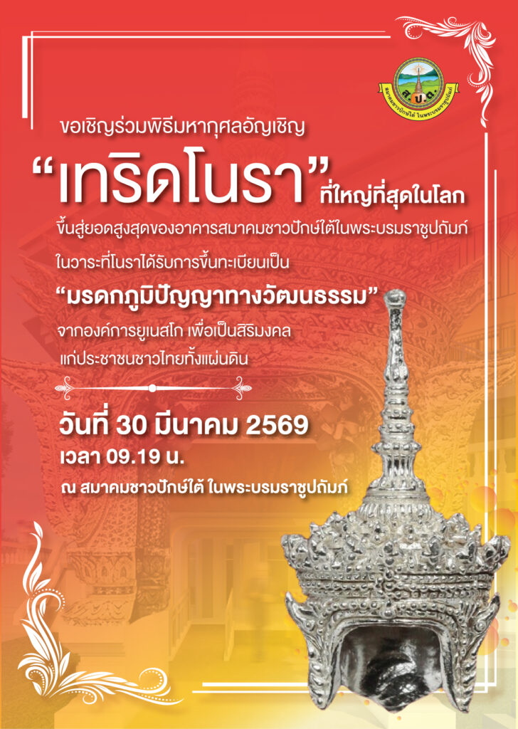 ทั้งนี้ ผู้มีจิตศรัทธาสามารถร่วมสมทบทุนบริจาคเพื่อร่วมเป็นส่วนหนึ่งของพิธีอัญเชิญเทริดโนราขึ้นสู่ยอดสูงสุดของอาคารสมาคมฯ ได้ที่